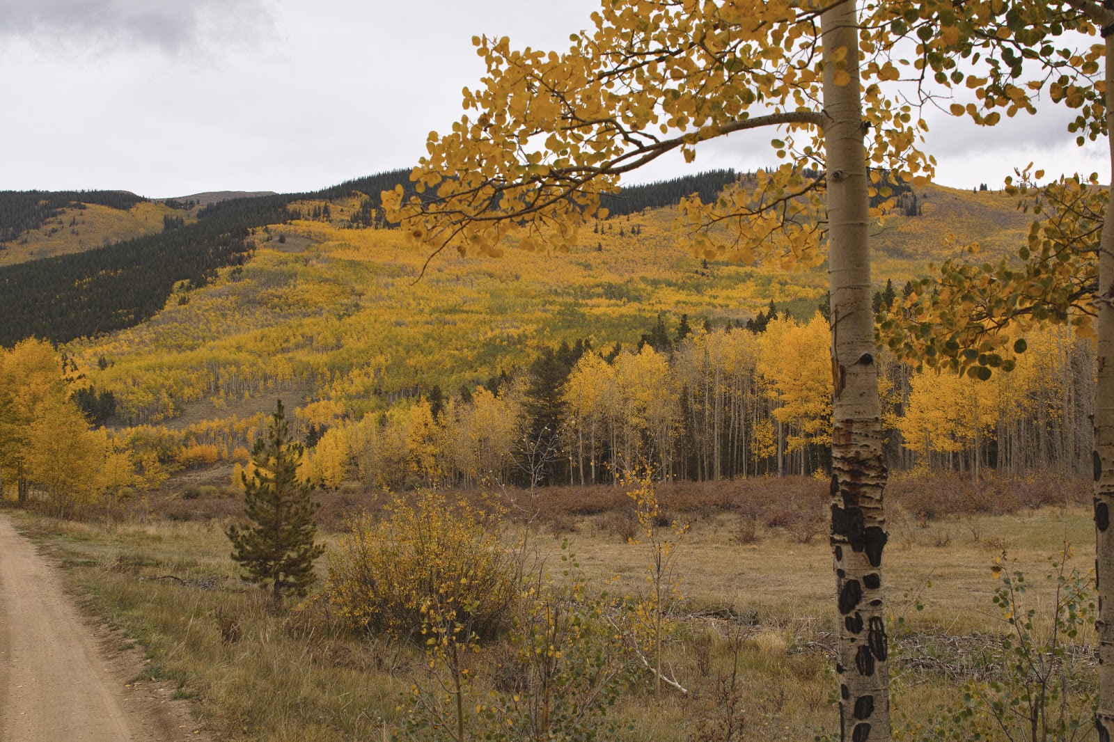 Kathleen and I spent our anniversary last year (September 18th, 2012) on a short trip to Buena Vista, Colorado to stay in a Bed and Breakfast. It was a great time for us, 34 years. We drove for Denver going over Kenosha Pass. We stopped at the summit of Kenosha Pass and walked through the aspen stands which were in full autumn color. It had rained and lightly snowed the previous night which left a blanket of aspen leaves on the forest floor shining with dew drops, Perfect!
